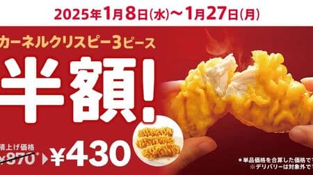 グルメ/スイーツ 【お得】ケンタッキー「カーネルクリスピー3ピース半額」キャンペーン 1月8日から!アレンジレシピも紹介 yuim 2024年12月29日 ケンタッキーフライドチキンで、「カーネルクリスピー3ピース半額」キャンペーンが実施されます。やわらかい鶏胸肉をにんにくと醤油をベースに味付けして専用衣で包んだ商品。…続きを読む えん食べ [グルメニュース] 【お得】ケンタッキー「カーネルクリスピー3ピース半額」キャンペーン 1月8日から… https://entabe.jp/57883/kfc-kernelcrispy-half-price-campaign-2025 ケンタッキーフライドチキンで、「カーネルクリスピー3ピース半額」キャンペーンが実施されます。やわらかい鶏胸肉をにんにくと醤油をベースに味付けして専用衣で包んだ商品。 Source: えん食べ こちらもおすすめです!【本日キャンペーン開始】【お得】ケンタッキー「カーネルクリスピー3ピース半額」キャンペーン 1月8日から!アレンジレシピも紹介 ケンタッキーフライドチキンで、「カーネルクリスピー3ピース半額」キャンペーンが実施されます。やわらかい鶏胸肉をにんにくと醤油をベー […]【2023年 最新】かぼちゃ新作スイーツまとめ!セブン・コメダ珈琲店・スタバ・銀座コージーコーナーなど 計18品 食レポもチェック! 【2023年9月13日版】 2023年秋に登場する、かぼちゃフレーバーの新作スイーツやドリンク、お菓子などをまとめてご紹介します!セブン・コメダ珈琲店・スタバ […]マクドナルド「生チョコクリームパイ」「ホワイトチョコミルクティーパイ」1月8日発売!とろけるホットパイ新作 マクドナルドで、サクサクのパイ生地にクリームをたっぷり詰めたホットスイーツ「とろけるホットパイ」の新商品「生チョコクリームパイ」と […]椿屋珈琲の「珈琲ゼリーとバニラアイス」【18品目】コーヒーゼリーが好き!シリーズ ドリンク付きで約1,800円 気になる「コーヒーゼリー」を実食していくシリーズ。18品目は、椿屋珈琲で提供されているスイーツメニュー「珈琲ゼリーとバニラアイス」 […]【本日発売】【11月18日~発売】セブン-イレブン 新商品パンまとめ「7P いちごミルクオムレット3個入」「はちみつ&マーガリン」など セブン-イレブンで、11月18日から順次発売される新商品パンをご紹介します。「7P […]ホテルで味わう冬の贅沢スイーツビュッフェおすすめ3選〜人気ホテルが贈る、香り・輝き・甘酸っぱさのホリデー体験〜 東京・名古屋のラグジュアリーホテルで、それぞれの世界観を映し出すスイーツビュッフェがスタート。この冬しか楽しめない特別な体験が用意 […]【10月21日~発売】セブン-イレブン 新商品スイーツまとめ「7プレミアム しろふわチーズスフレ 3号」「かぼちゃ&マスカルポーネ生どら焼」など セブン-イレブンで、10月21日から順次発売される新商品スイーツをご紹介します。「7プレミアム しろふわチーズスフレ […]【秋の“食×エンタメ”祭り】話題のコラボメニュー3選──『三国志:戦乱』からミッフィー、少年サンデーのお祭りまで この秋は外食チェーンや話題の作品のコラボが目白押しです。「磯丸水産×三国志:戦乱」から、横浜がミッフィー色に染まる「Dick […]バーガーキングから「オン ザ ビーフ」3種が新登場!直火焼きビーフの旨さをそのまま楽しむ限定メニュー バーガーキングは直火焼きの100%ビーフパティをダイレクトに味わえる「オン ザ […]【9月16日~発売】セブン-イレブン 新商品パンまとめ「7P おいものオムレット3個入」「ダブルカスタードクリーム」など セブン-イレブンで、9月16日から順次発売される新商品パンをご紹介します。「7P […]リンツ 夏にしか味わえないショコラフルーツ3選|ジューシーなフルーツ×なめらかなチョコレート リンツでは、ジューシーなフルーツを使ったぜいたくなチョコレートが発売されています。夏だからこそ味わえるショコラフルーツをぜひご堪能 […]【本日発売】【7月29日~発売】セブン-イレブン 新商品スイーツまとめ「3種チーズのとろ生食感チーズケーキ」「いちごレアチーズもこ」など セブン-イレブンで、7月29日から順次発売される新商品スイーツをご紹介します。「3種チーズのとろ生食感チーズケーキ」や「いちごレア […]【7月29日~発売】セブン-イレブン 新商品スイーツまとめ「3種チーズのとろ生食感チーズケーキ」「いちごレアチーズもこ」など セブン-イレブンで、7月29日から順次発売される新商品スイーツをご紹介します。「3種チーズのとろ生食感チーズケーキ」や「いちごレア […]【夏限定メニュー】バーガーキングが新開発のチキンパティで勝負する「スモーキーフライドチキンバーガーズ」3品を期間限定発売 バーガーキングから、約3年かけて完成したこだわりのチキンパティで仕上げた新バーガーシリーズが登場します。スモーキーな香りと7種のス […]成城石井 果実をたっぷり乗せたアイスが登場!たっぷりの果汁と果実を使ったジェラートバーと新作カップアイス3種 成城石井で、まるで果物シリーズのジ