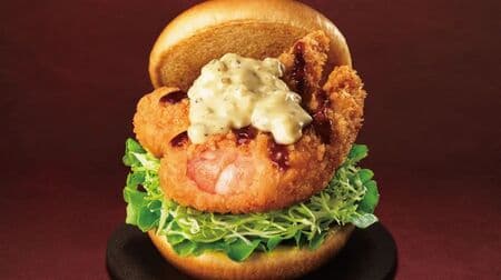 モスバーガーで、数量限定の「海老エビフライバーガー」が販売されます。グリーンリーフと千切りキャベツの上に海老フライを2本乗せ、カツソースとタルタルソースを合わせたハンバーガー。