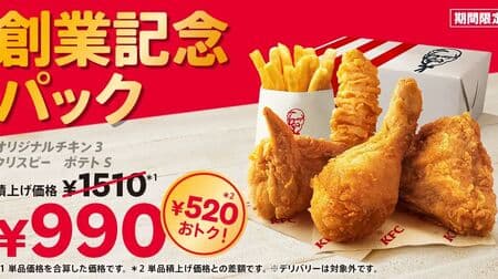 ケンタッキーフライドチキンで、創業55周年の感謝を込めた「創業記念パック」が販売されます。オリジナルチキン・カーネルクリスピー・ポテト入りで520円お得な990円。