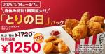 グルメ/スイーツ 【ケンタッキー】450円もお得食べれるバグすぎキャンペーンがなんと21日間も開催決定(驚)ケンタに急げーー! yuim 2026年3月18日 ケンタッキーフライドチキン(KFC)で、通常28日限定の「とりの日パック」が3月18日から4月7日まで販売期間を拡大。オリジナルチキン4ピースとナゲット5ピースのセットが、単品積上げ価格より470円引……続きを読む えん食べ [グルメニュース] 【ケンタッキー】450円もお得食べれるバグすぎキャンペーンがなんと21日間も開催決… https://entabe.jp/59866/kfc-torinohi-pack-2026-spring ケンタッキーフライドチキン(KFC)で、通常28日限定の「とりの日パック」が3月18日から4月7日まで販売期間を拡大。オリジナルチキン4ピースとナゲット5ピースのセットが、単品積上げ価格より470円引きの1,250円でお得に楽しめますよ。 Source: えん食べ こちらもおすすめです!【2026年3月】ピエール マルコリーニ・ゴディバ・ジェラートピケカフェなど、注目スイーツ&ドリンク春の新作特集 ~Nicolai Bergmann・ジョエルロブション~ 春の訪れとともに、ピエール […]【3月24日~発売】セブン-イレブン 新商品スイーツまとめ「もっちもち食感クレープ チョコバナナ」「7プレミアム クリームが主役のふんわりロールケーキ・ミルク」など セブン-イレブンで、3月24日から順次発売される新商品スイーツをご紹介します。「もっちもち食感クレープ […]【2026年3月】スターバックスなど春の新作スイーツ&ドリンク最新情報まとめ~ベルアメール・キャギ ド レーブ・kawara CAFE~ 3月は人気カフェやショコラトリーから春の限定スイーツやドリンクが続々と登場しています。完熟白桃を丸ごと味わうフラペチーノ、イースタ […]【2026年3月発売】チョコレート新商品まとめ「洋酒薫る大人のスイーツ 深夜のショコラノワール」「ミルクマニアいちご」など 2026年3月に発売されるチョコレート新商品をまとめてご紹介します。「洋酒薫る大人のスイーツ […]【2026年最新版】ミスタードーナツ 宇治抹茶ドーナツシリーズ「ドら抹茶 つぶあん華ホイップ」「ポン・デ・ザク宇治抹茶ミルク風」など5種 ミスタードーナツで、祇園辻利の宇治抹茶を使用した「宇治抹茶ドーナツシリーズ」が販売されます。「ドら抹茶 […]【KALDIの注目ドリンク】南国気分が味わえる海外ジュース5選|グァバ・マンゴー・パッションなど KALDI(カルディ)で買える海外ジュースを5つ紹介します。マンゴーやグァバなど、トロピカルフルーツの風味が楽しめる人気ドリンクを […]【2026年3月発売】新作アイスまとめ第3弾!「MOW(モウ) ブルーベリーレアチーズ」「もはや生チョコを凍らせたようなアイス」など 2026年3月に発売される新作アイスまとめの第3弾をご紹介します。「MOW(モウ) […]【2026年3月最新】外食チェーン 新商品・新メニューまとめ第3弾!吉野家・やよい軒・なか卯・かっぱ寿司・ゼッテリアの5ブランド 2026年3月に外食チェーン各社から登場する新商品・新メニューまとめの第3弾をご紹介します。吉野家、やよい軒、なか卯、かっぱ寿司、 […]【2026年3月】注目の新作スイーツ・春限定フレーバー最新情報~ゴディバ・モロゾフ・コナズ珈琲など~ 桜の季節が近づく2026年3月、人気スイーツやカフェから春を感じる限定商品が次々登場しています。ふわしゅわチーズケーキ、ゴディバの […]【3月17日発売】ファミリーマート 新商品パンまとめ「きな粉餅風サンド」「濃厚チョコデニッシュ」など ファミリーマートで、3月17日に発売される新商品パンをまとめてご紹介します。「きな粉餅風サンド」や「濃厚チョコデニッシュ」など。… […]2026年3月、関東のホテル&話題スポットで味わう、今春注目の贅沢スイーツ&ドリンク特集~横浜ベイシェラトン、ローズホテル横浜、Disney HARVEST MARKET~ 3月春の訪れとともに、関東のホテルや話題のカフェから、季節感あふれるスイーツやドリンクが続々と登場しています。いちごの食べ納めを楽 […]KALDIで人気のおすすめ「冷凍スイーツ」5選!ティラミスケーキやシナモンロール、予約必須のテリーヌドショコラなど KALDI(カルディ)には、ティラミスロールケーキやクイニーアマンなど手軽に楽しめる冷凍スイーツが揃っています。温めるだけで本格的 […]【2026年3月】春の新作スイーツ&ドリンク最新情報|グランドカステラ・ヨックモック・タリーズ・沢村で見つける、この春の一口 花見の季節が近づく2026年3月、人気のカフェやスイーツブランドから春を彩る新商品が続々と登場しています。台湾カステラの限定フレー […]【3月17日発売】ローソン 新商品スイーツまとめ「ICHIBIKO いちごのシューロール」「しっとりむぎゅっ!バナナケーキ」など ローソンで、3月17日に発売される新商品スイーツをまとめてご紹介します。「ICHIBIKO […]【コストコ】最大1200円引き商品も…!!22日までセール商品が大量放出中〜 見逃し厳禁セール商品32選 EMMI […]【2026年春】DEAN & DELUCA(ディーン&デルーカ)新商品まとめ|桜クッキー缶や限定ギフトなど注目アイテム D